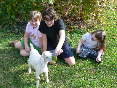 The girls with Snowflake, our first Nubian Kid. Our hearts were broken when Snowflake, at 4 months old, suddenly became ill and passed away on January 15, 2006. However, we were so inspired by our experiences in trying to raise him from 1 week old, that we have recently bought 4 more kids, to do our best to have a herd of these enjoyable animals.